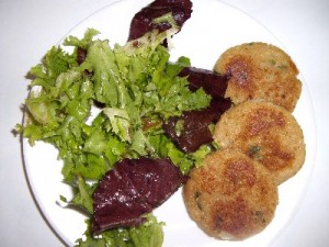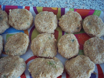 3 – Mélanger le tout avec le jaune d’œuf, faire des boulettes puis les aplatir et les trempées des deux cotés dans la chapelure