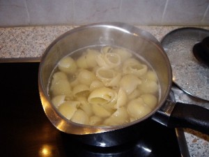 5-A la sortie des lumaconis les dressés dans un plat, ajouter le coulis de tomate et servir chaude