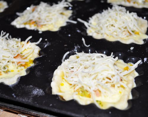 8 – Dans un bol, mélanger les œufs et la crème et verser l’équivalent de deux cuillères à soupe sur chaque quiche. Parsemer de fromage râpé et enfourné pour 20 à 25 min dans un four toujours préchauffé à 180°